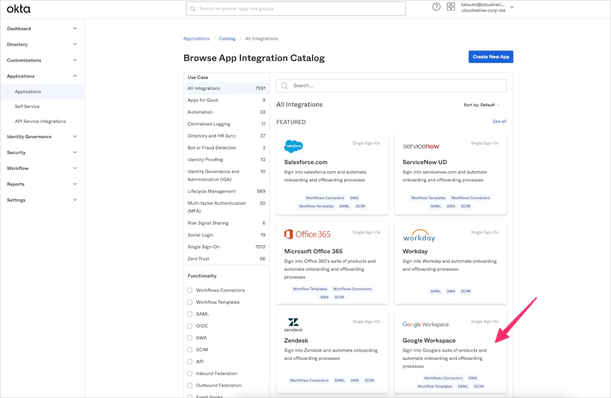 - Okta管理画面へログインし、Applications>Applications>Browse App Catalogをクリックします。トップページに表示されているGoogle Workspaceをクリックします。