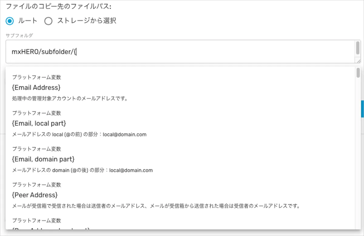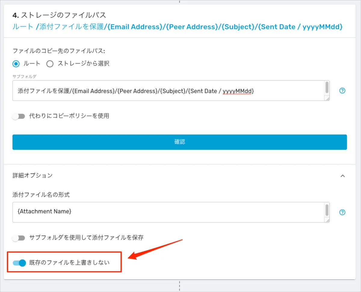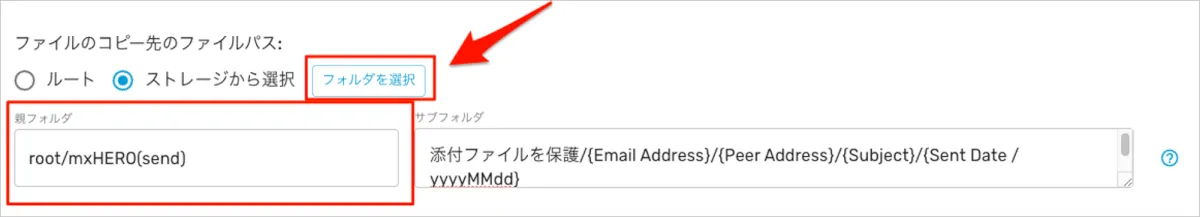 - 保存先のアカウント内のどのフォルダパスで添付ファイルを保管するか設定します。