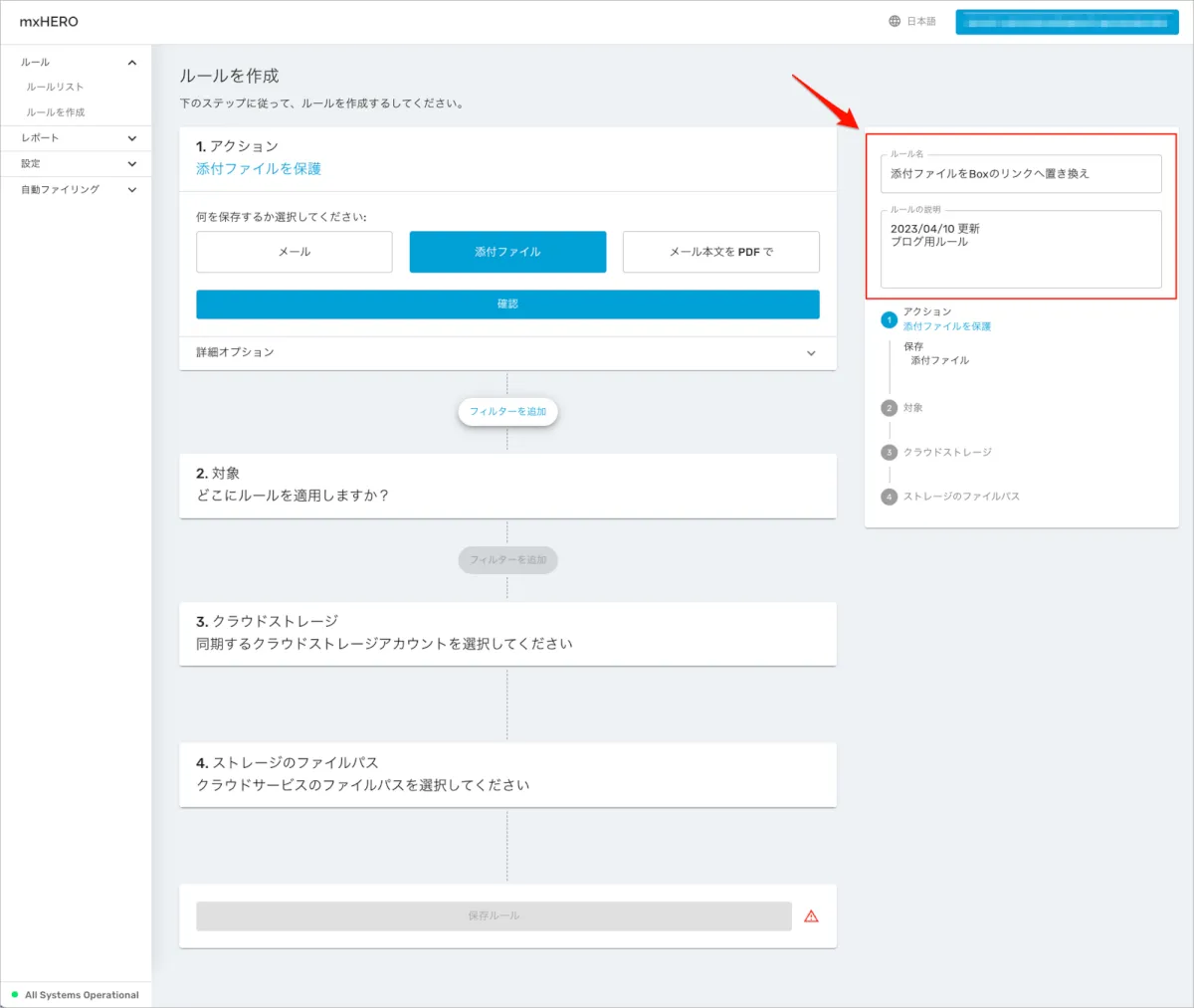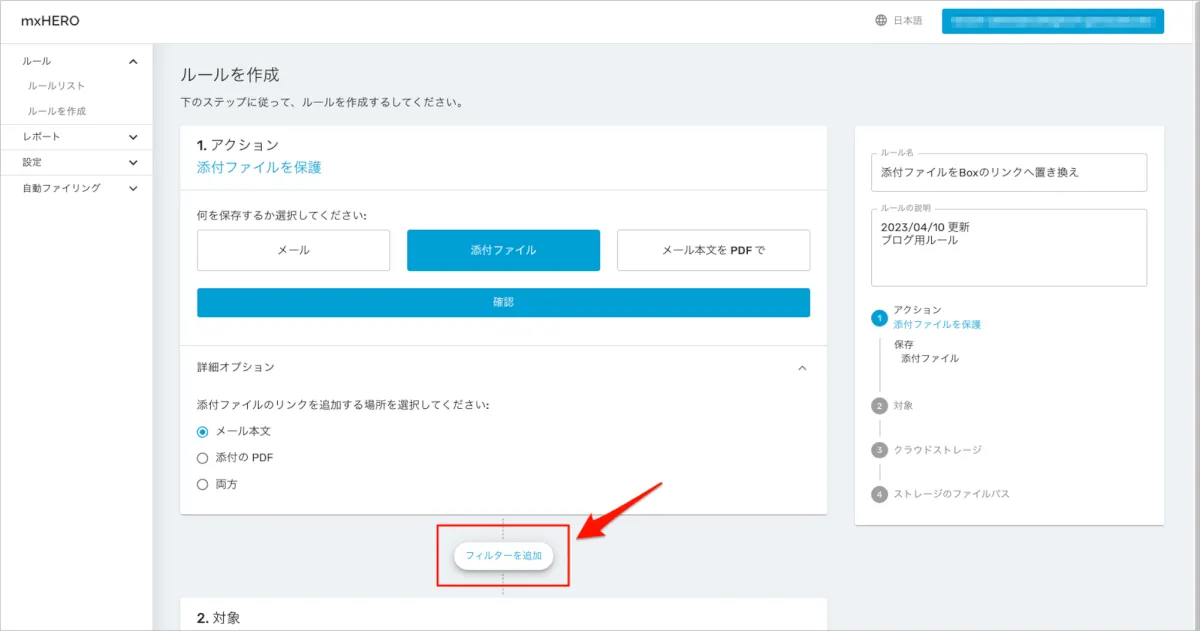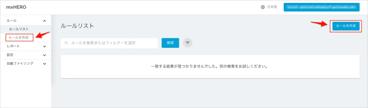 - mxHEROの管理ダッシュボードにログインし、左側メニューの「ルール」 > 「ルールリスト」を開き、右上の「ルールを作成」を選択します。