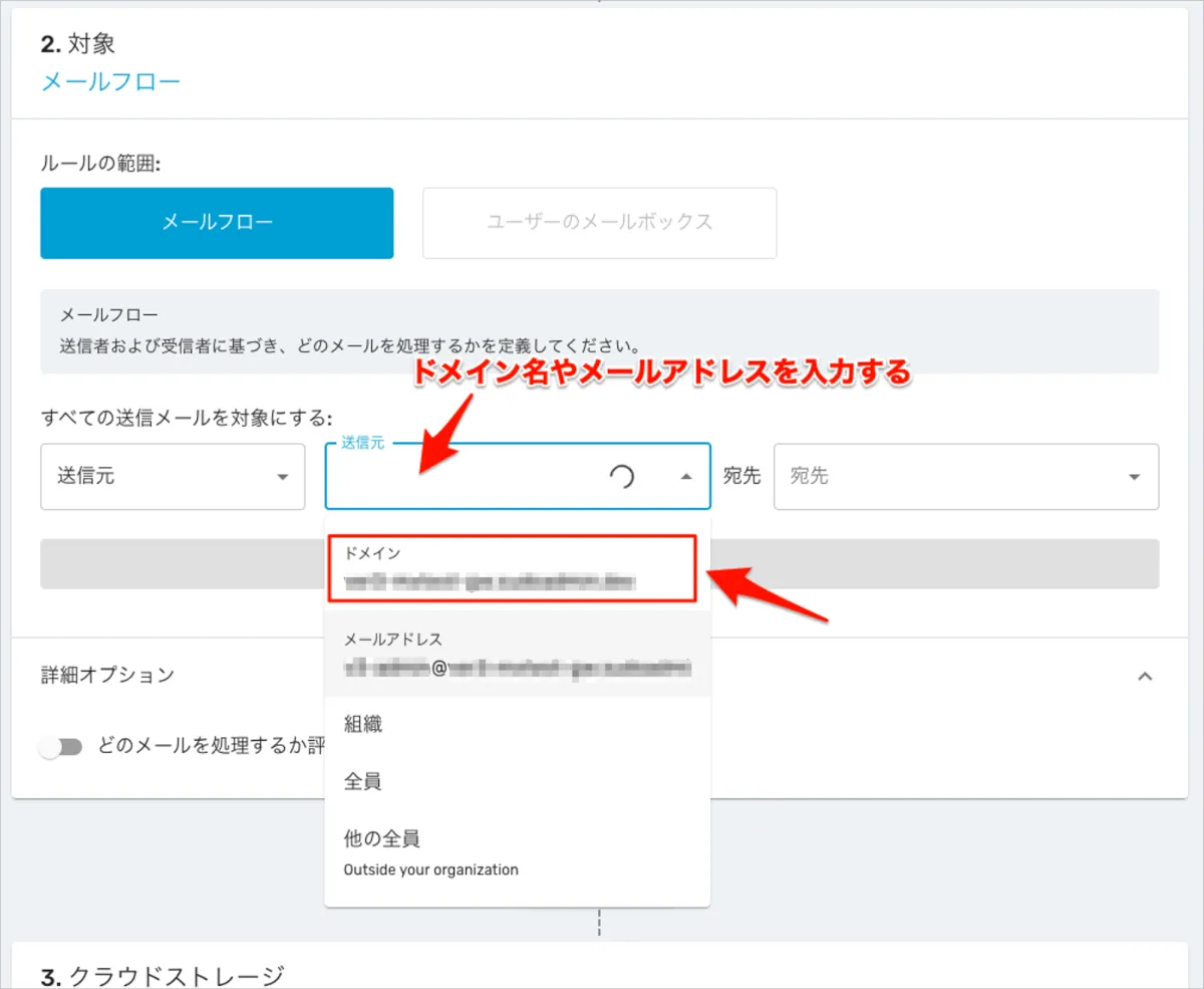 「宛先」でもメールドメインやメールアドレスを指定する事が可能です。 例えば、「送信元」と「宛先」を自社のメールドメインに設定すると自社内同士のメールに対するルールとなります。