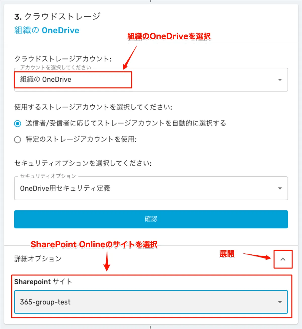 - 詳細オプションを展開し、「Sharepointサイト」から保存先のサイトを選択します。