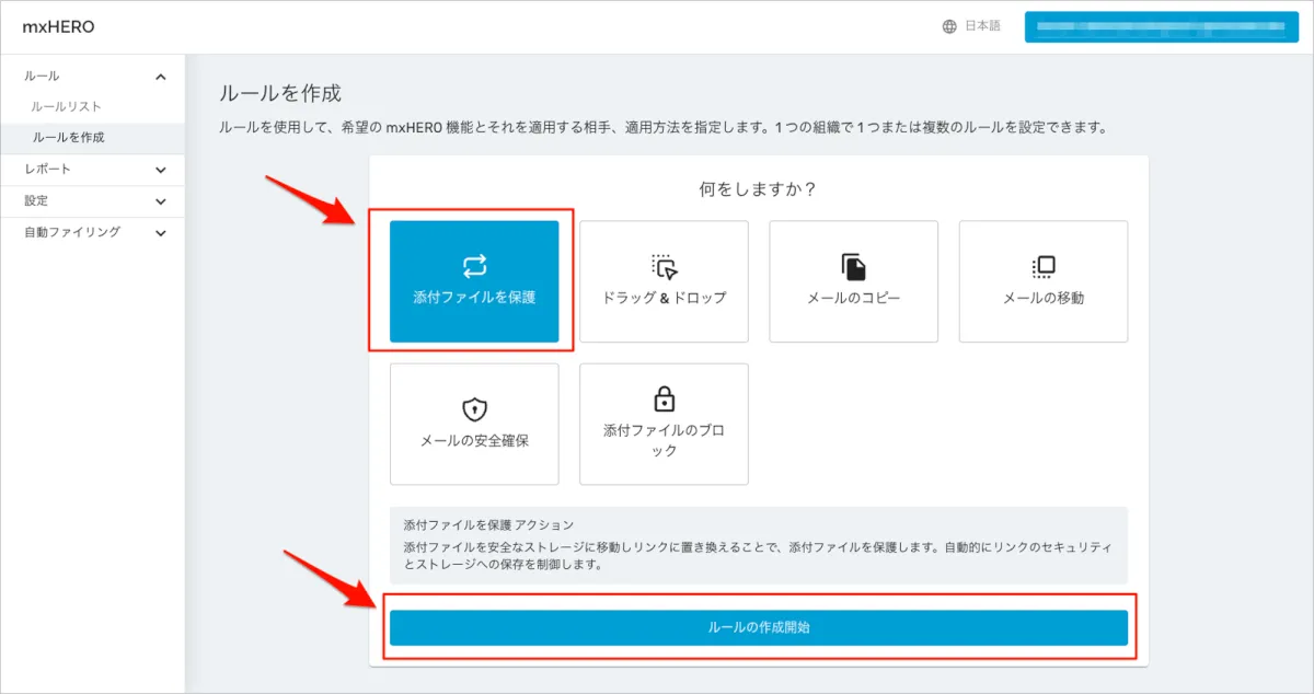 - 今回は添付ファイルを共有リンクに置き換えるルールなので、[添付ファイルを保護]を選択し、[ルールの作成開始]を選択します。