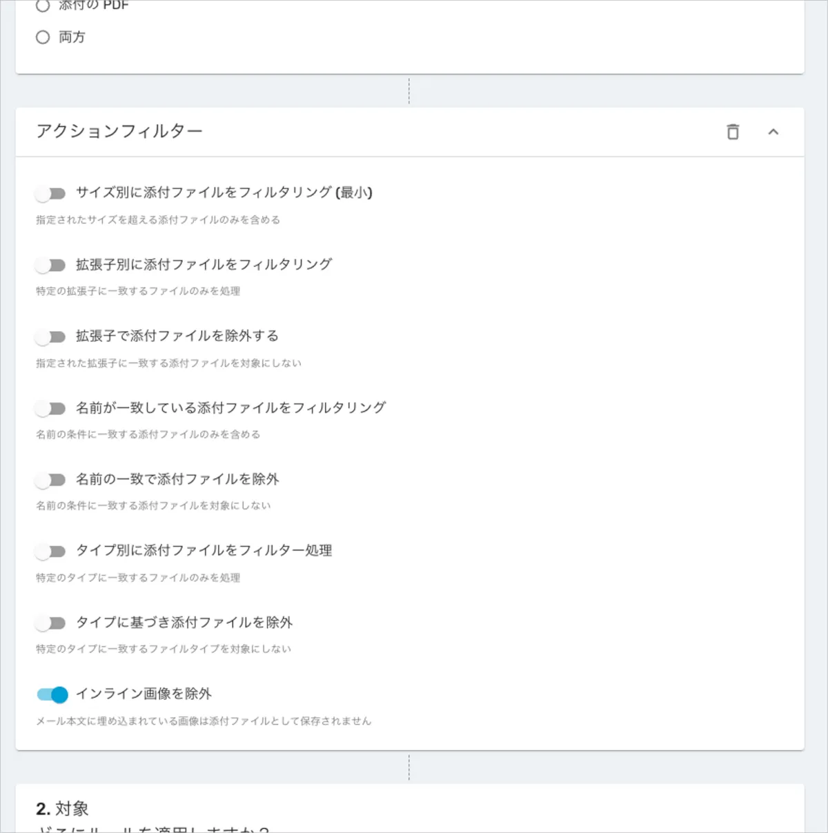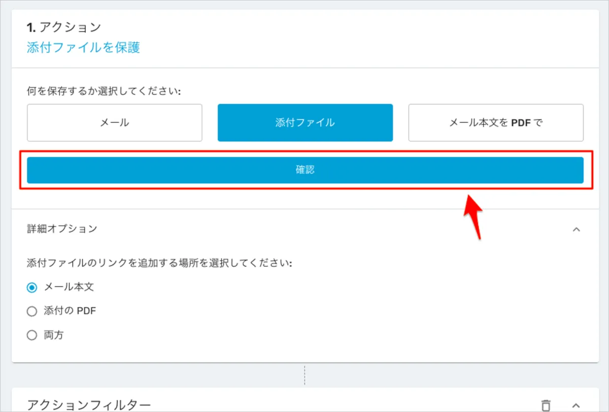 - 「1. アクション」内の「何を保存するか選択してください」で「添付ファイル」が選択されていることを確認し、詳細オプションを展開します。