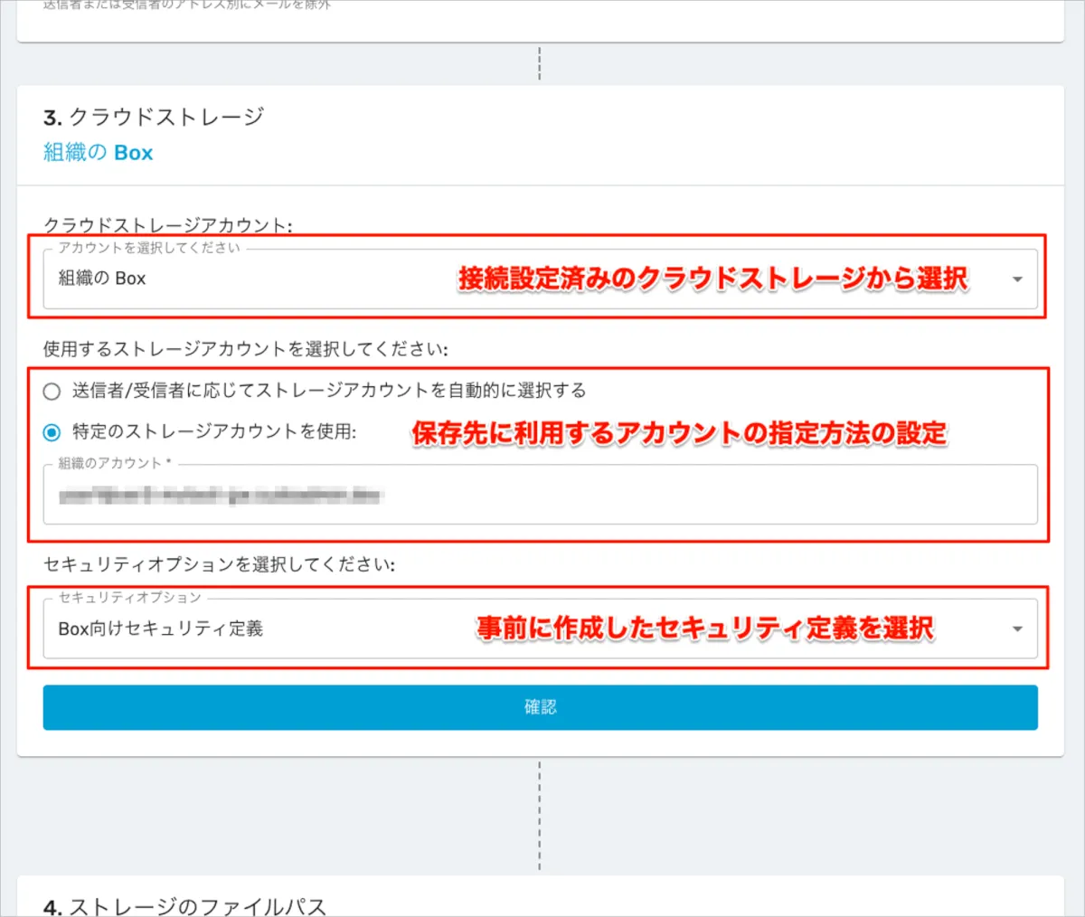 - 次にクラウドストレージ内の保管先として利用するストレージアカウントの設定を指定します。
