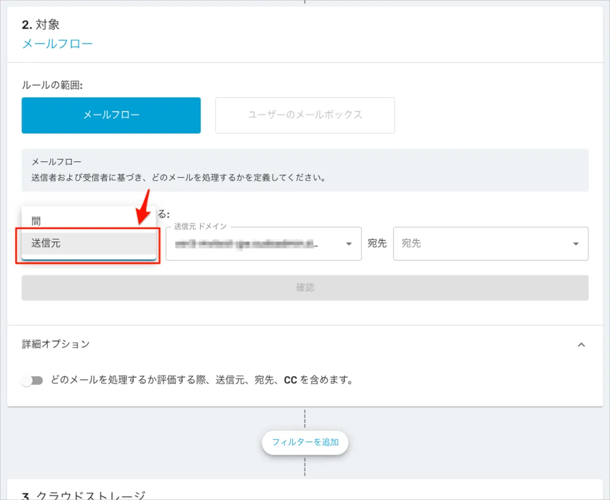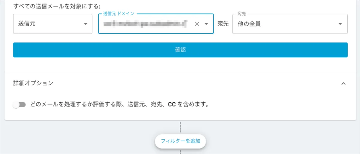 - 詳細オプションを展開し、設定する事ができますが、「どのメールを処理するか評価する際、送信元、宛先、CC を含めます。」オプションはデフォルトの無効のまま「確認」を選択します。