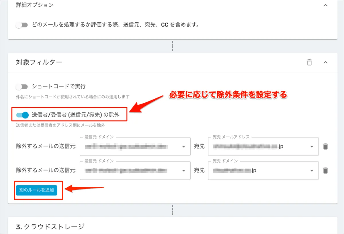 - 「送信者/受信者 (送信元/宛先) の除外」では送信元や宛先を指定して、このルールから除外する設定が可能です。