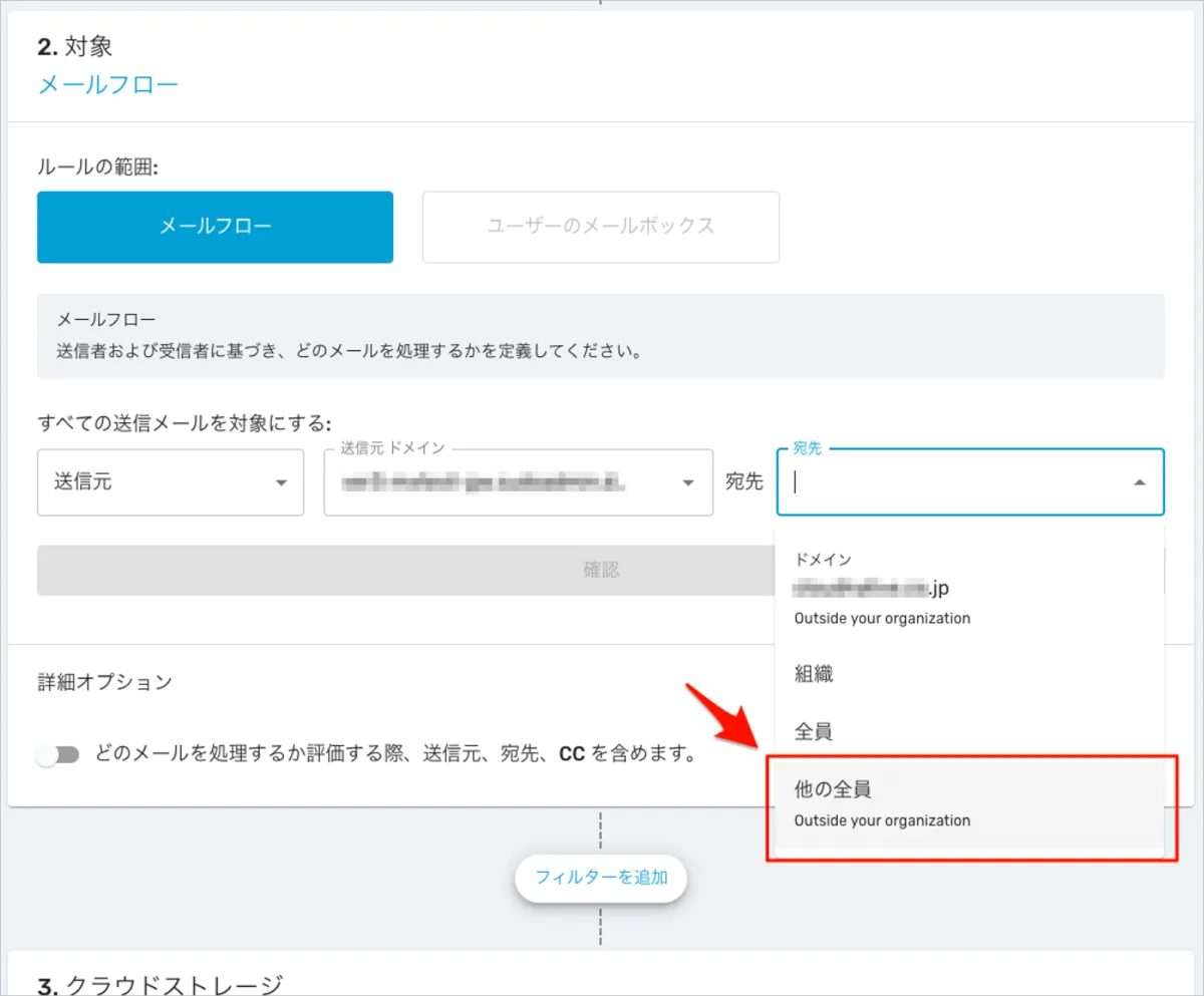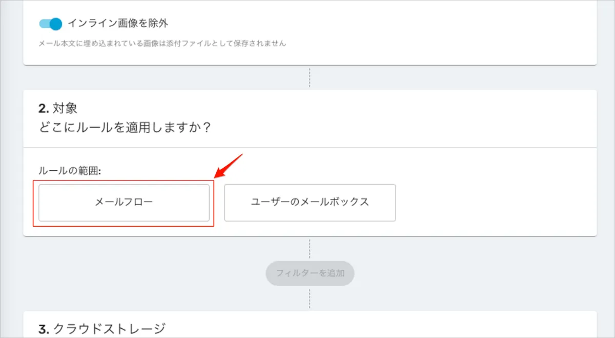 - メールフローを選択すると、ルールを適用する範囲の設定に進みます。
