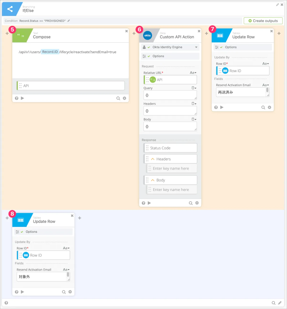 - Falseの場合は7.とほぼ同様にUpdate Rowカードで3.のCreate Rowで作成した時のアウトプットであるRow IDを指定し、テーブルのResend Activation Emailカラムに直接、対象外という文字列を指定します。(カード解説)