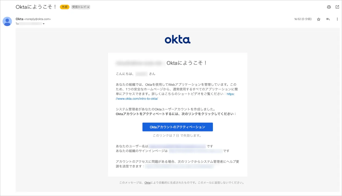 - Okta管理画面で1週間の有効期限付きのアクティベーションメールの初回送付を行う