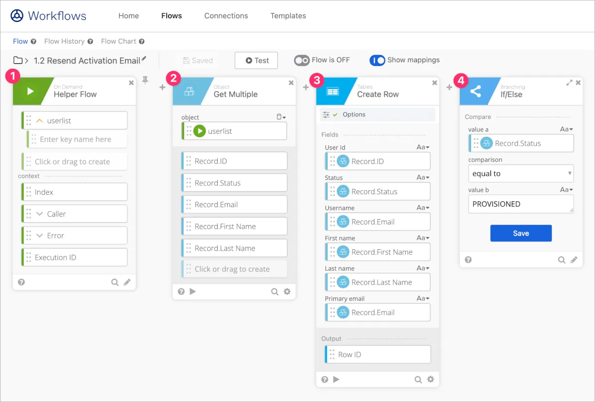 - List Users with Searchカードで全てのOktaユーザーを取得する設定とし、オプションでStream Matching Recordsを選択し、Helper FlowにOktaユーザーデータを1件1件渡します。(カード解説)