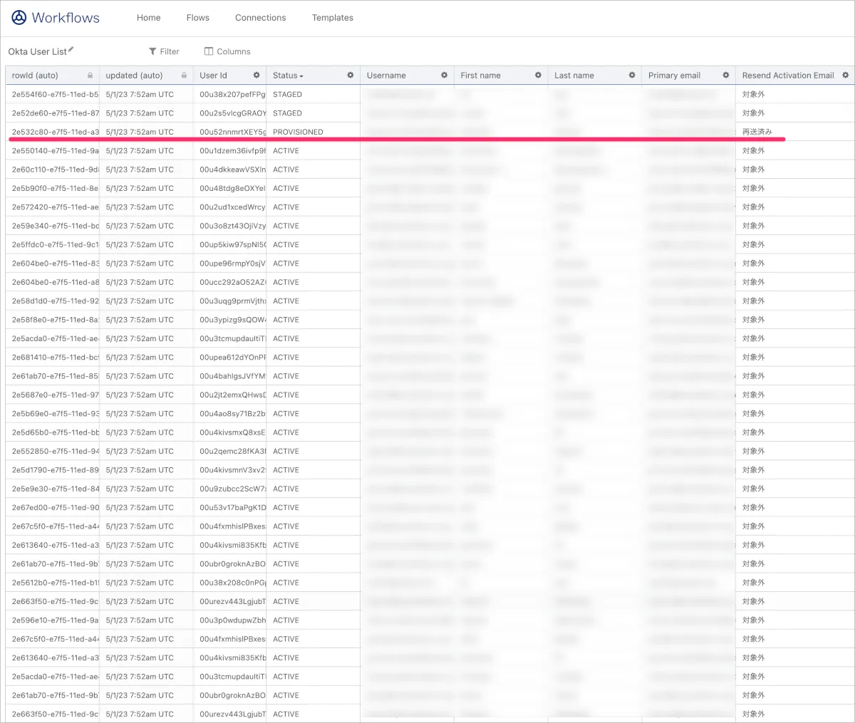 テーブルにもStatusがPROVISIONEDのみに対してResend Activation Emailのカラムが再送済みがセットされています。