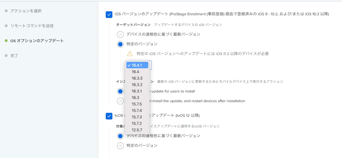 こちら、Jamfの一括処理コマンドを確認してみました。16.4.1(a)は選択できません。<s>一括処理でのバージョンアップは本日時点ではできない模様です。後日アップデートされる可能性もありますが…削除可能な仕様からすると一括処理は無さそう?</s>