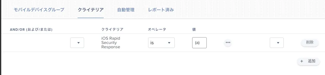 スマートデバイスグループの条件判定でクライテリアに「iOS Rapid Security Response」を選択し、値に今回のバージョンである「(a)」を選択すれば緊急セキュリティ対応適用済みデバイスを抽出できます。その際はOSバージョンとのand条件設定を行なった方が良いでしょう。