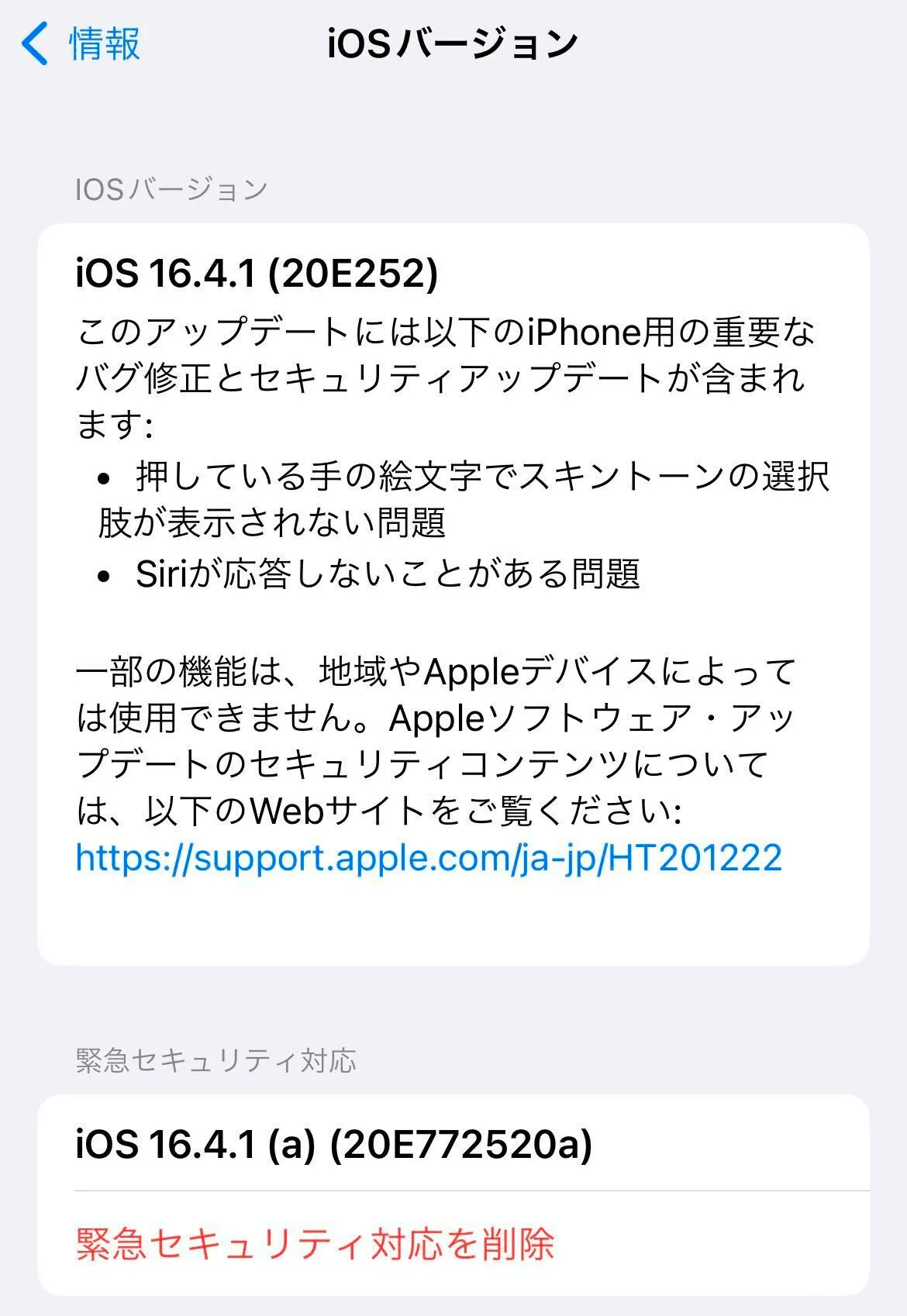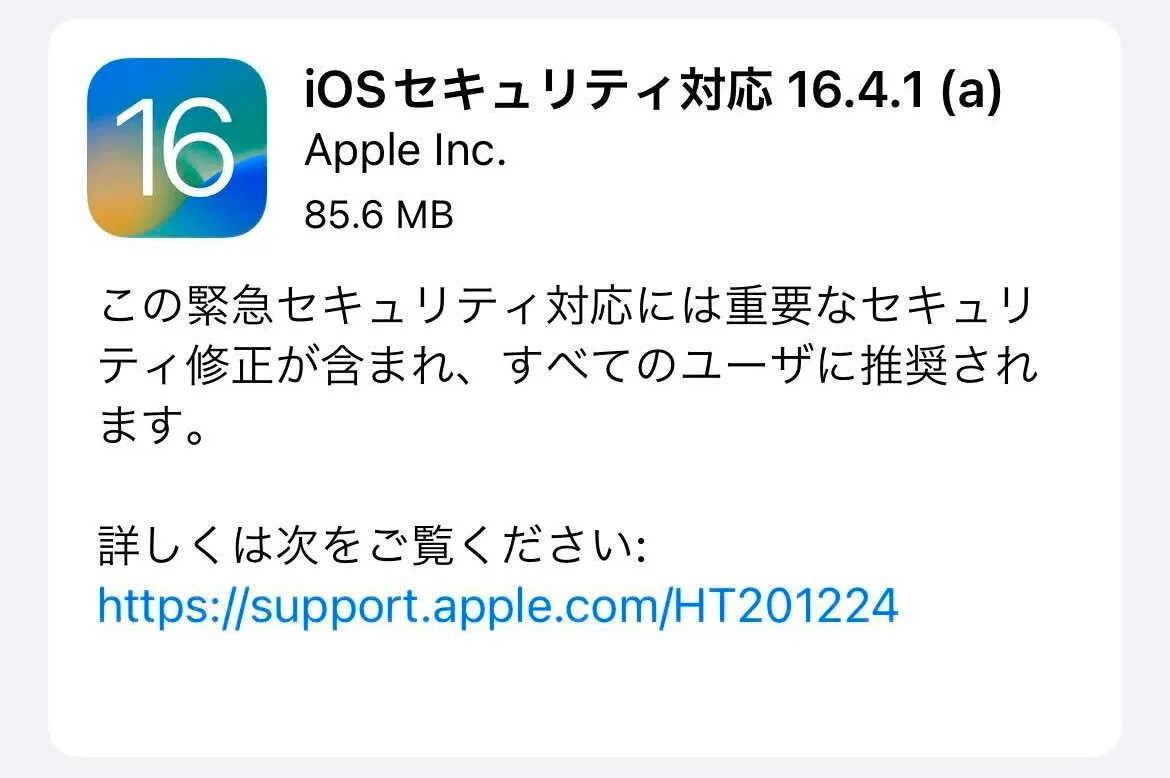 iOS/iPadOS16/macOS13からは、Apple社が最新バージョンに対するセキュリティ更新のみを速やかに配信する場合には、バージョンアップでなく緊急セキュリティ対応を配信するようになりました。