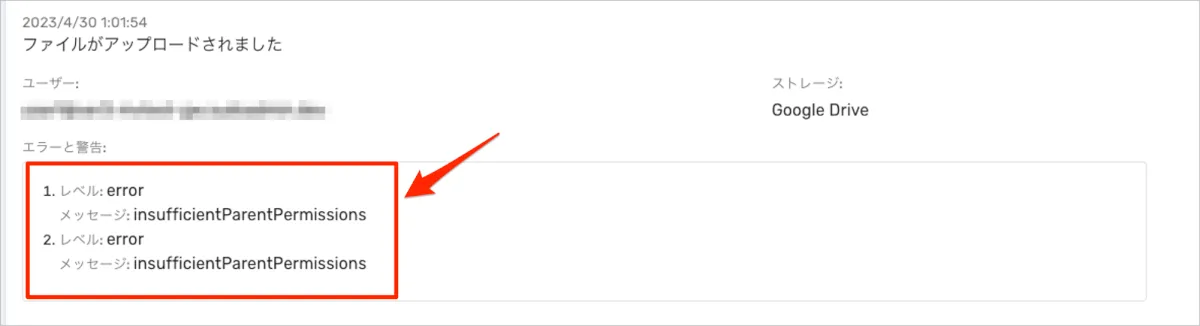 Google Drive内部で「insufficientParentPermissions」や「notFound」エラーになっていることがmxHEROのトレースログでわかります。