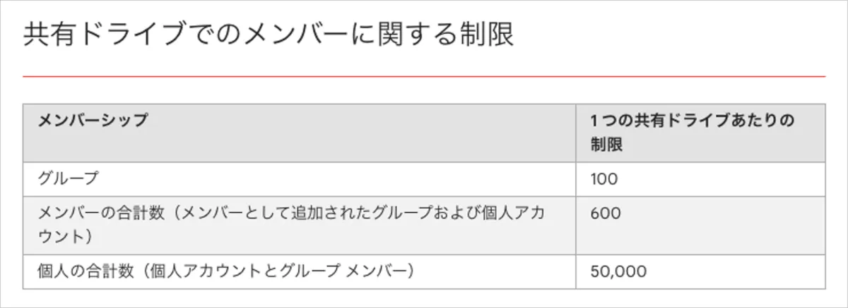 - 50000ユーザー以上の組織の場合は後述のように共有ドライブの仕様で制限があるため、ルールと共有ドライブの分割した上で分割したルールに沿ったグループをメンバーにする運用を検討する必要があります。