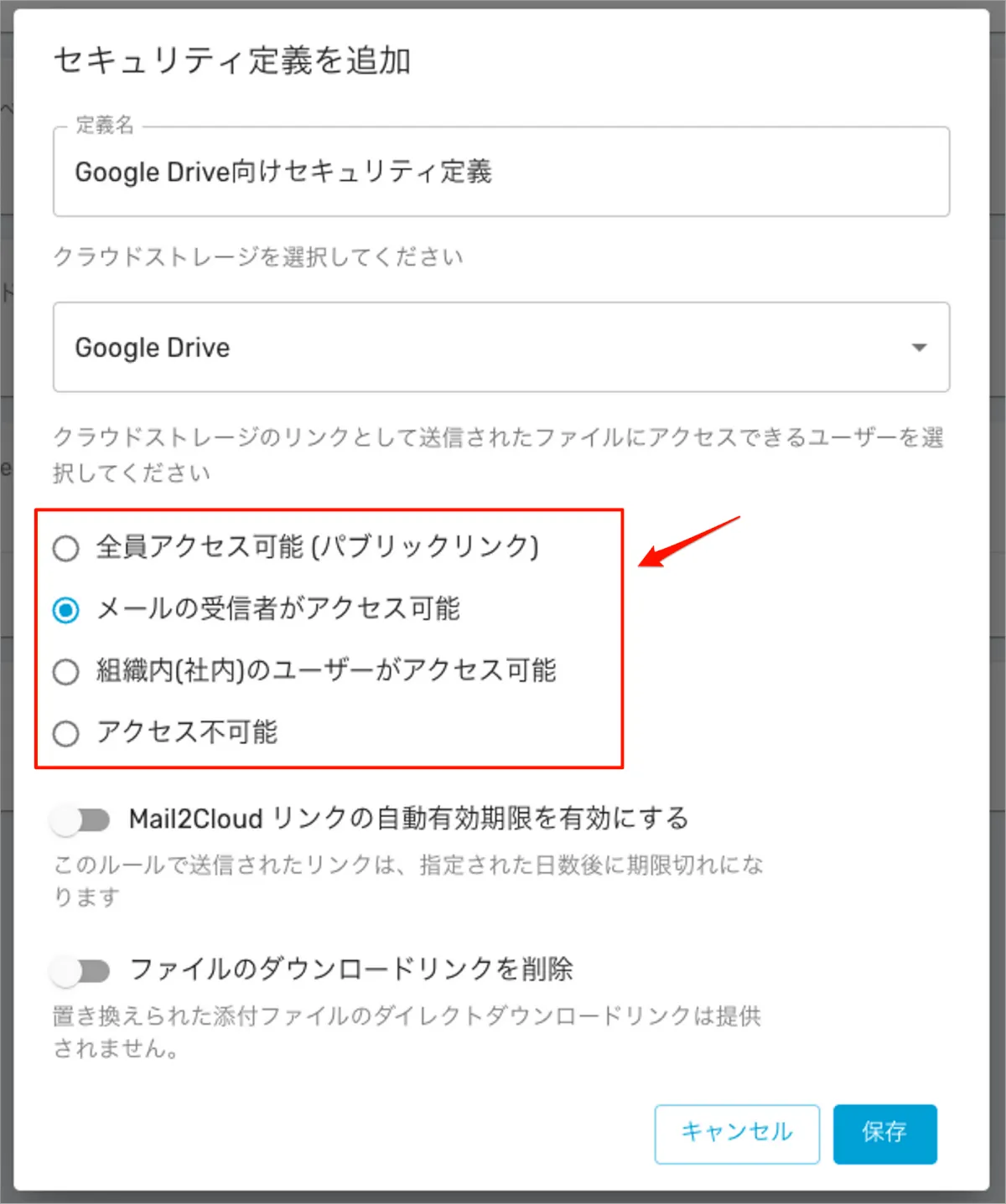 なお、この設定方法内では「セキュリティ定義」はマイドライブ時と同様に事前に作成したセキュリティ定義を指定してください。
