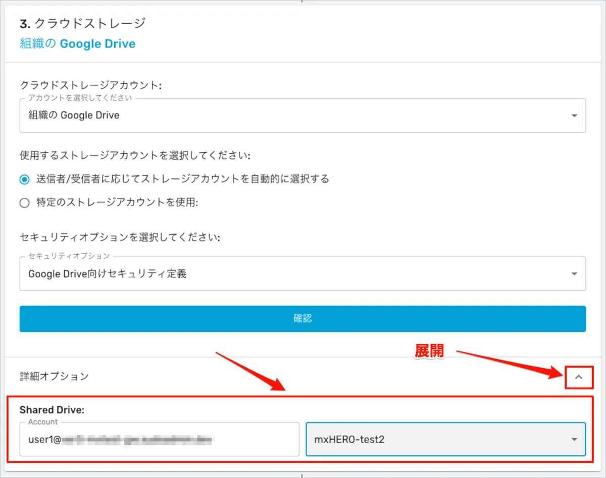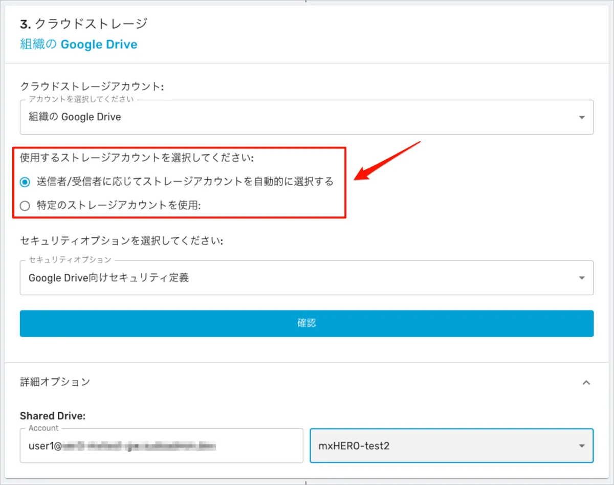 - 詳細オプションで指定したアカウント指定は無視され、マイドライブへの保存設定としてルールは動作します。
