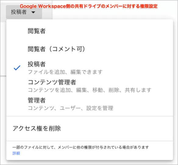 - ここの2種類の設定は従来と同じ考え方ではありますが、はじめに記載したように共有ドライブに対する権限を意識する必要があります。