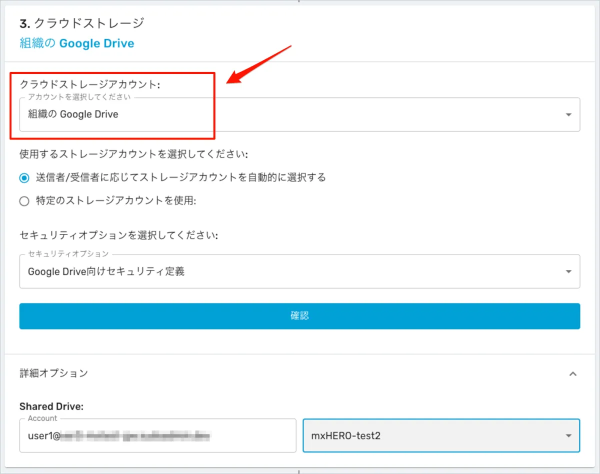 クラウドストレージを「組織のGoogle Drive」を選択する