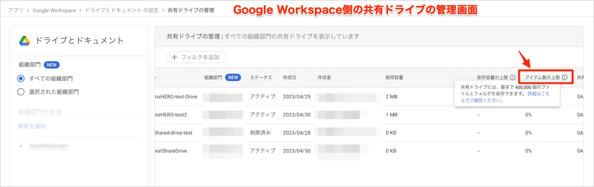 なお、共有ドライブのアイテム数の利用率はGoogle Workspaceの管理コンソールから目視で確認することが可能です。
