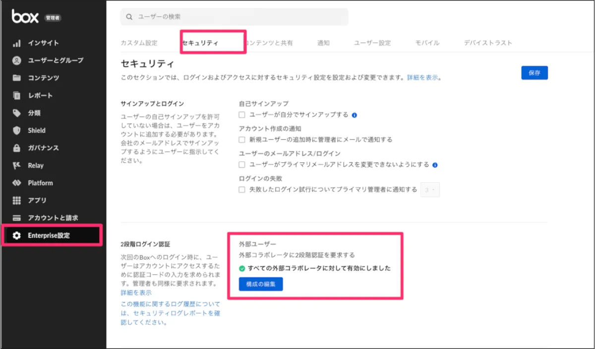 [管理コンソール] > [Enterprise設定] > [セキュリティ] に移動し、[2段階ログイン認証] セクションの [外部ユーザー] で、[構成] をクリックします。[外部コラボレータ向けの2段階認証] ダイアログボックスで、以下を設定します。