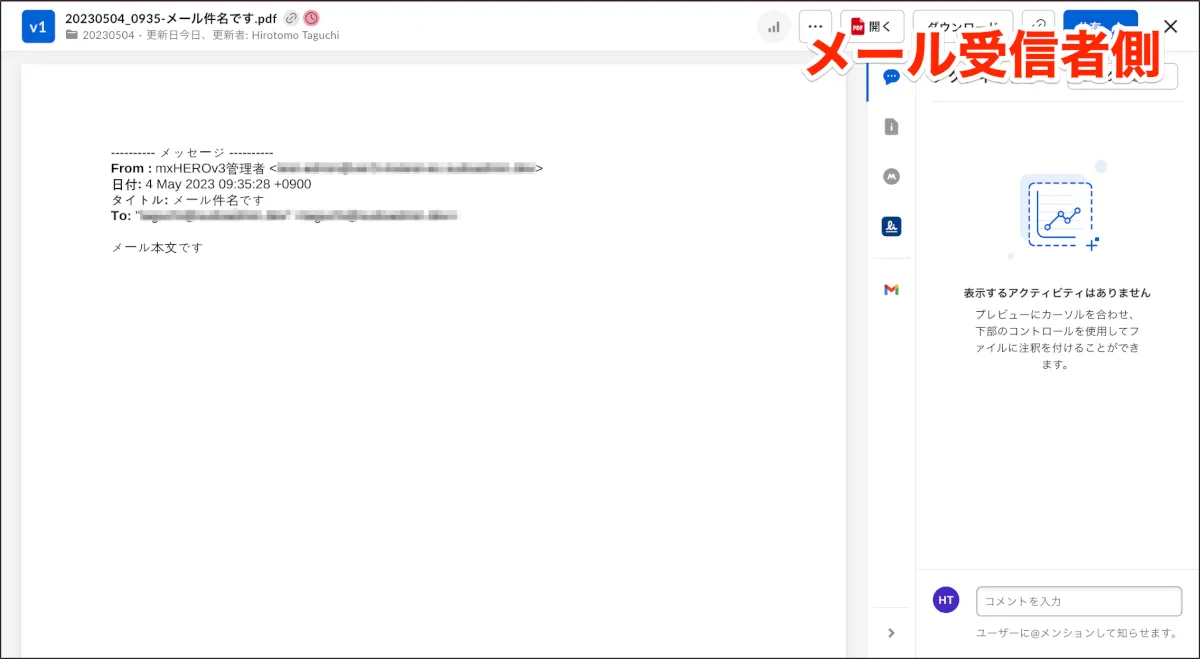 すると、下記のようなメールが届きます。メール自体にはメールの件名は記載されていますが、メールの本文は記載されておらず、Boxリンクが添付されています。