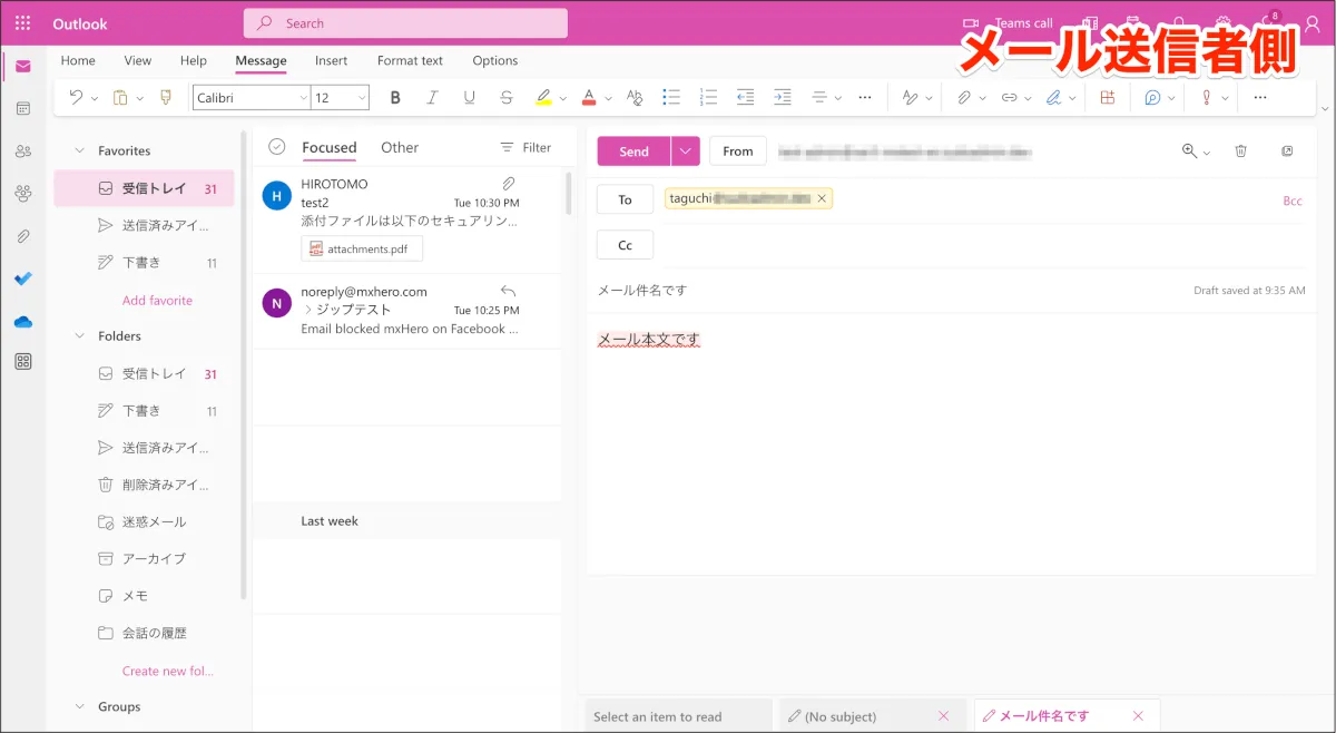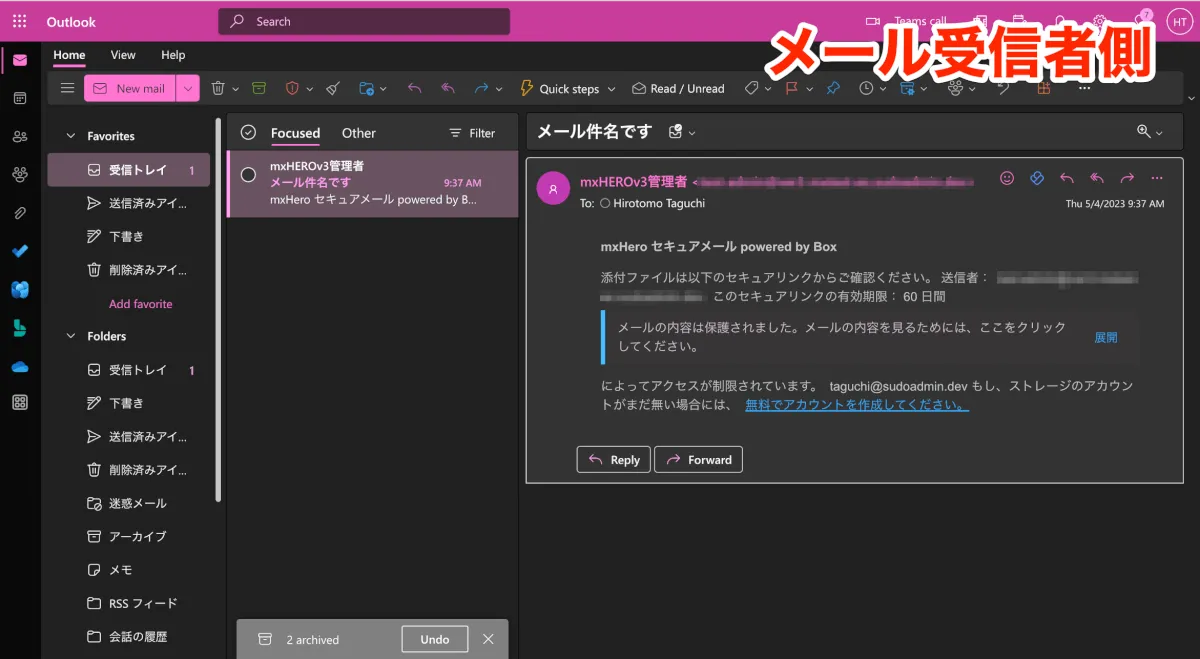 そこで、mxHEROの「セキュアメール」のオプションを使うと、メールの本文を含めてクラウドストレージ経由(Box)で送付し、さらにBox側で多要素認証必須化のオプションを施せばメールを見る前にユーザーに多要素認証実施を要求することができます。そのため、少なくとも「自分が送信するメールの内容」に関しては暗号化された状態で相手まで届けることが可能となります。