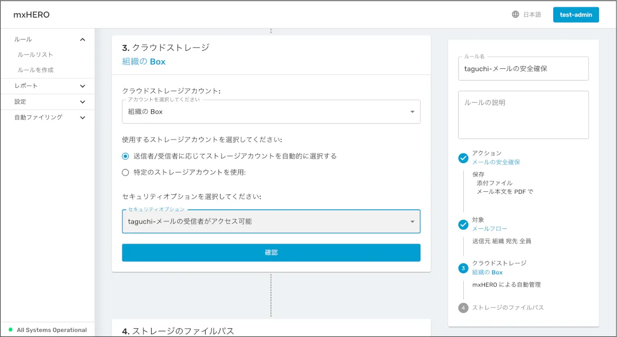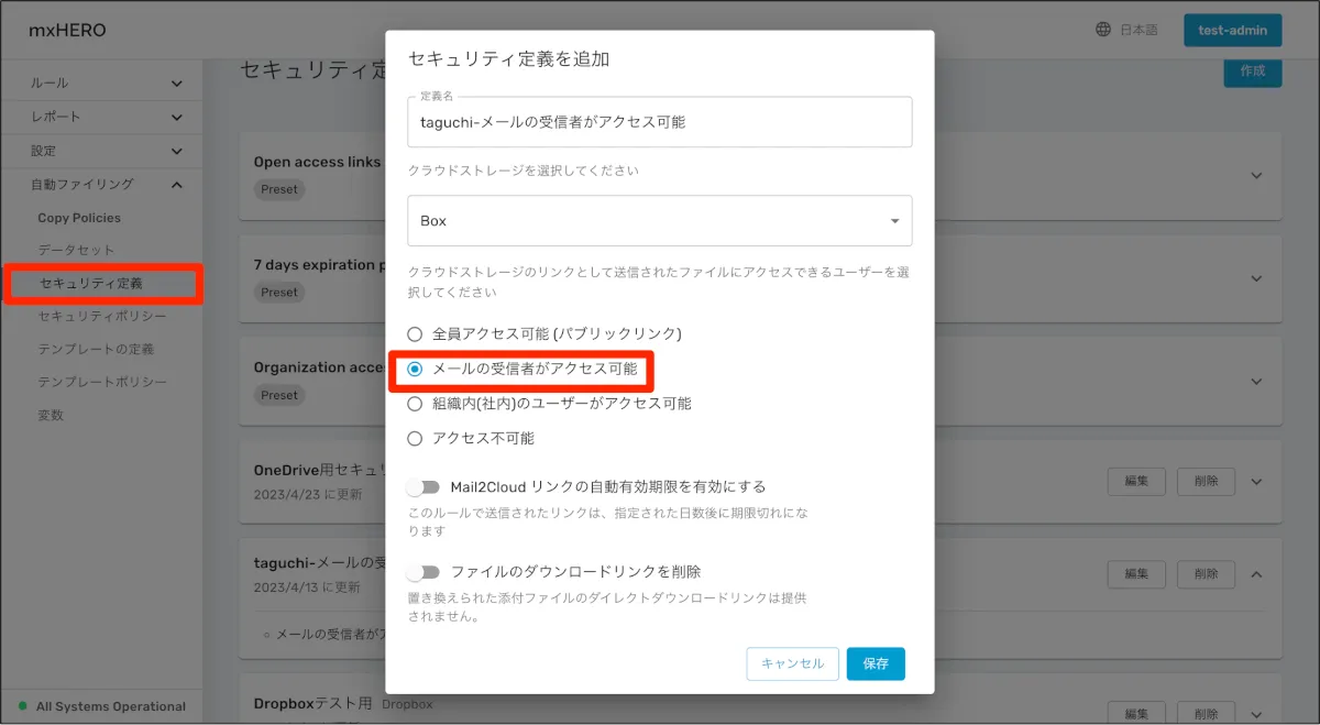 クラウドストレージの設定ではBoxを選択し、セキュリティオプションで先ほど作成したセキュリティ定義を選択して設定終了です。
