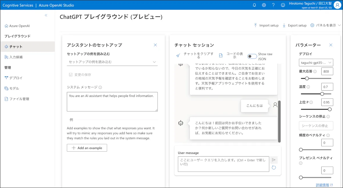 - ユーザーがAIモデルに対して質問事項などをinputします。inputの方法としてはAPI経由でinputを行うか、Open AI Studioに対しての権限を持っていればGUIでの実行が可能です。