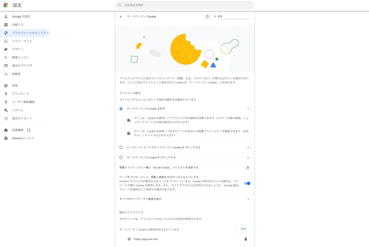 - サードパーティーのCookieの使用を許可するサイト一覧にBoxのURLを追加すると元通りに!