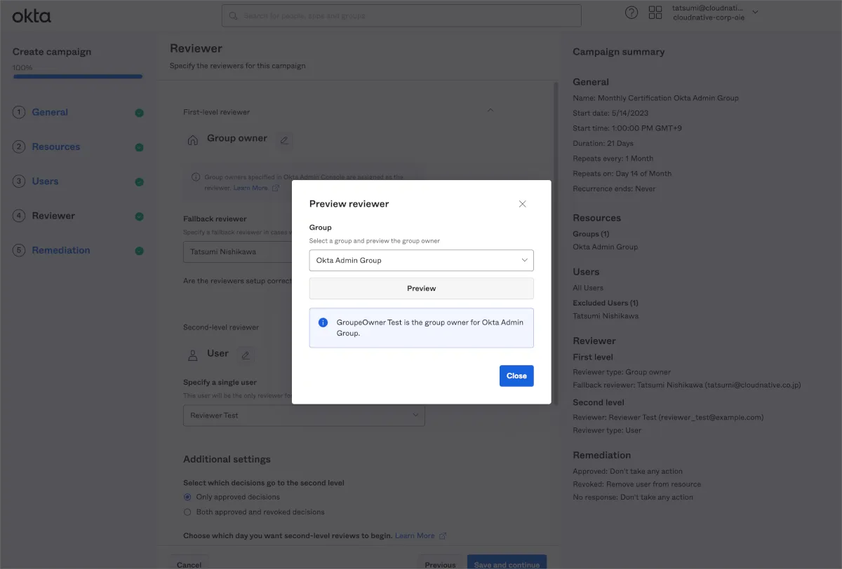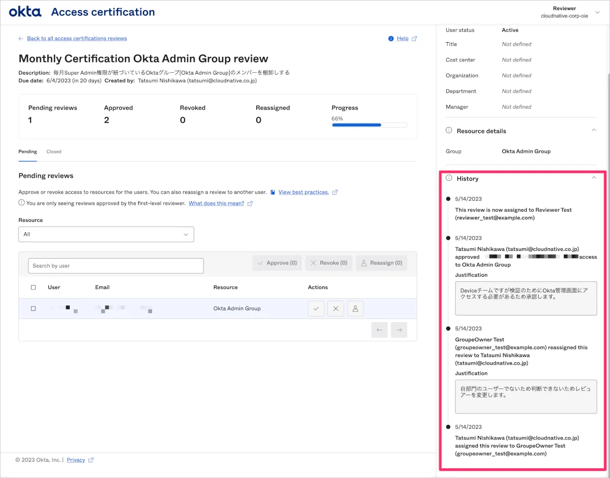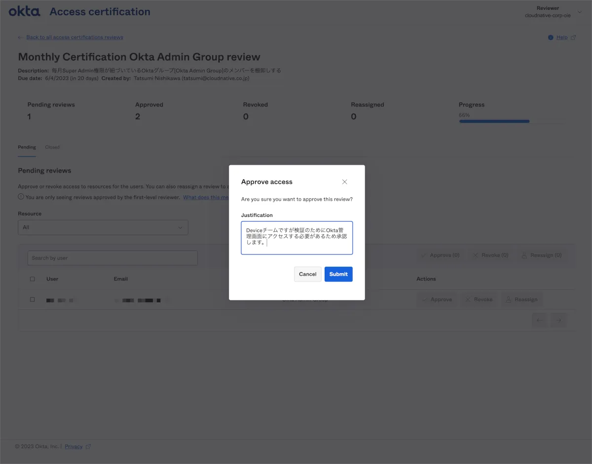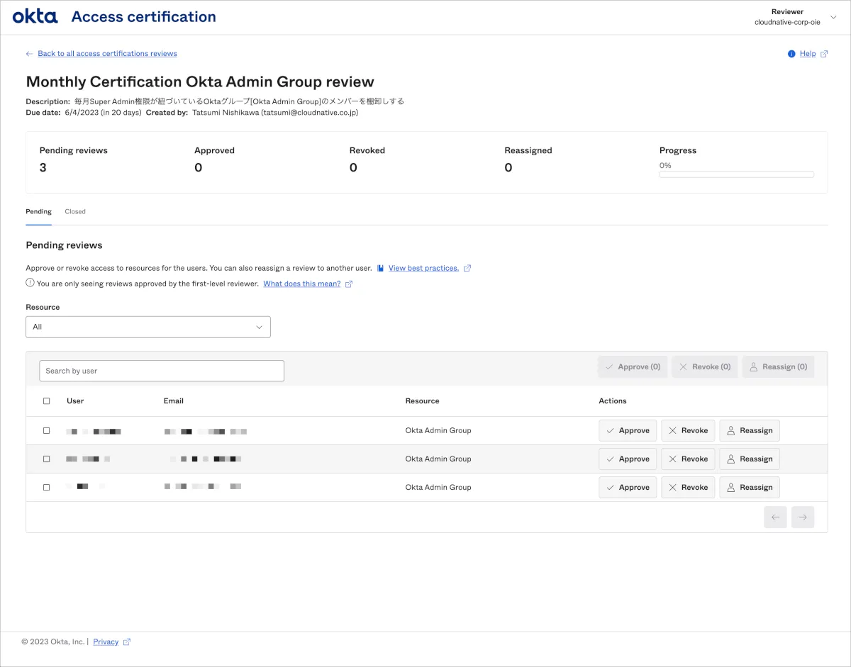 reviewer_test@example.com- 今回のAccess Certification campaignでは2段階目にアクセスレビューを行う人