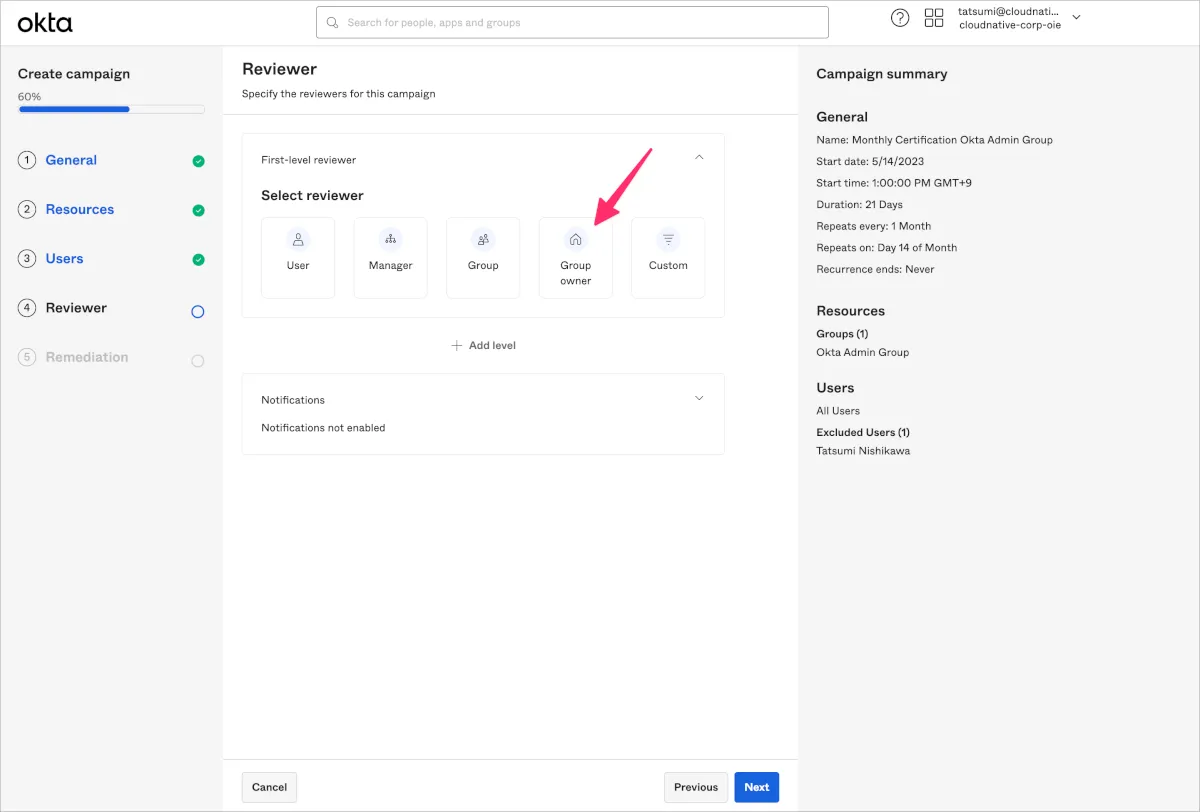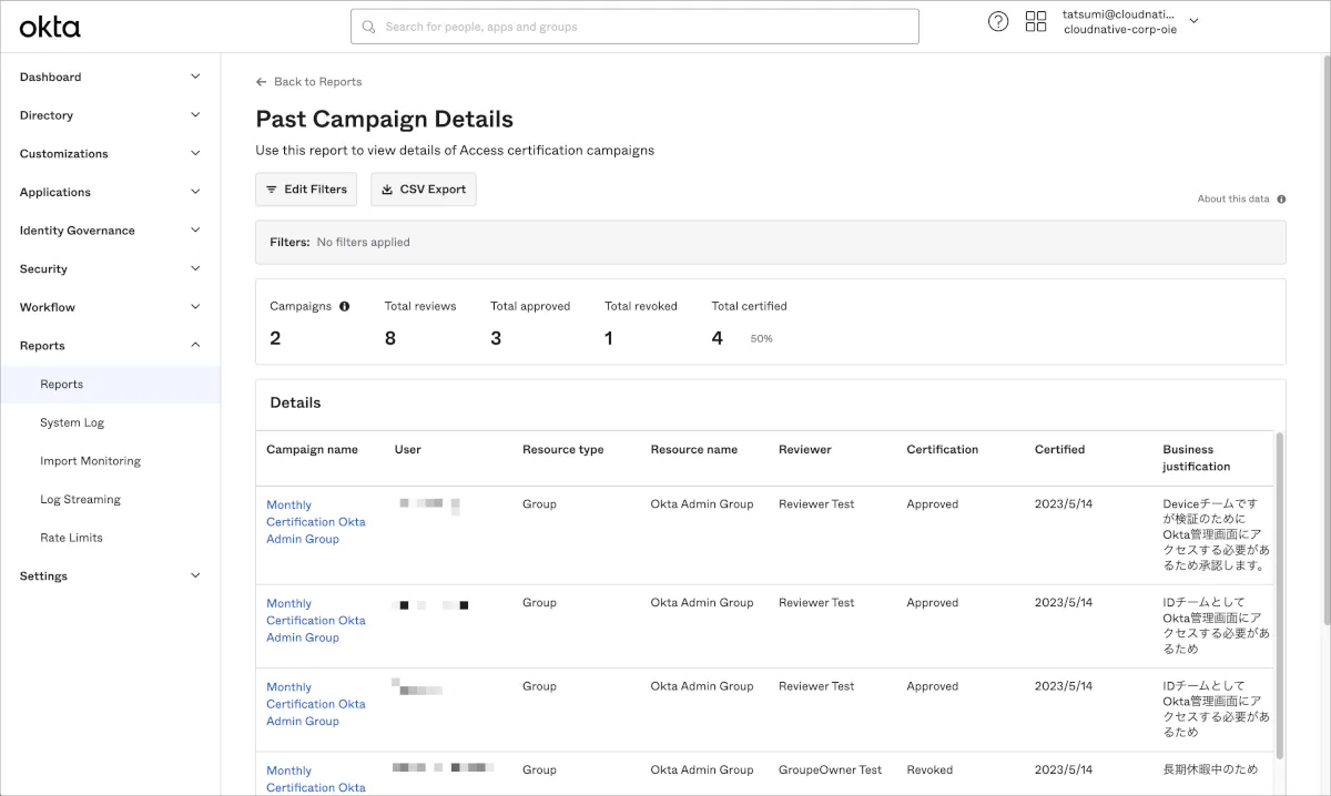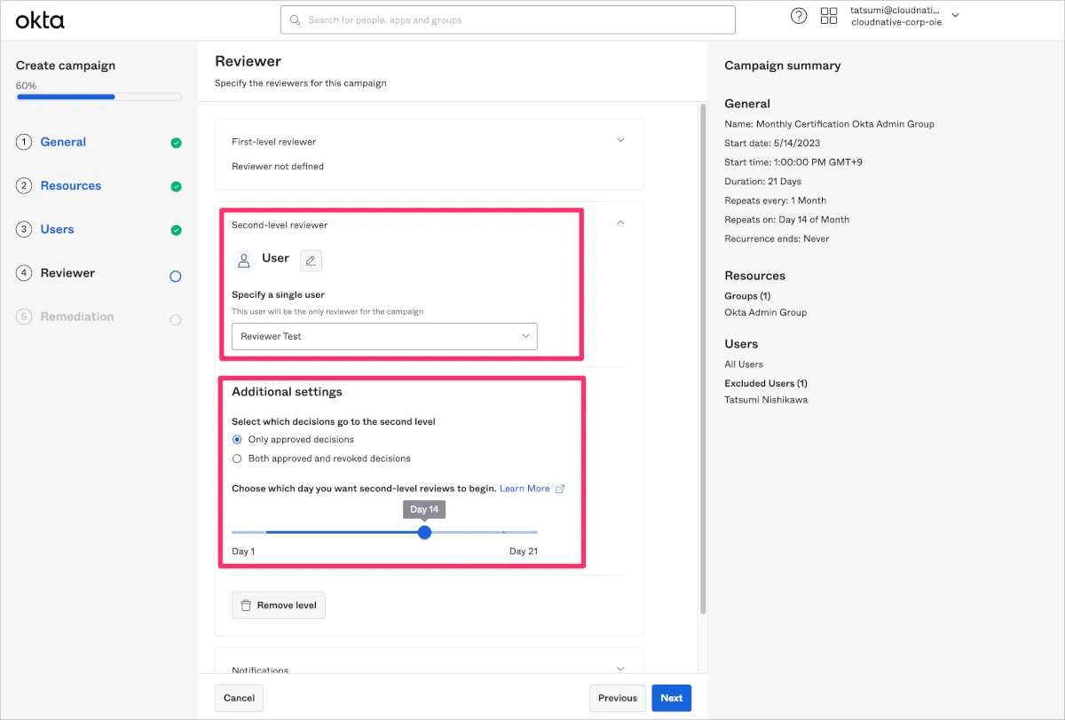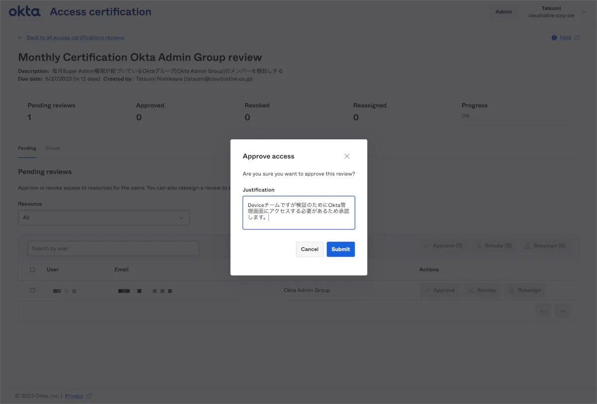reviewer_test@example.com- 今回のAccess Certification campaignでは2段階目にアクセスレビューを行う人
