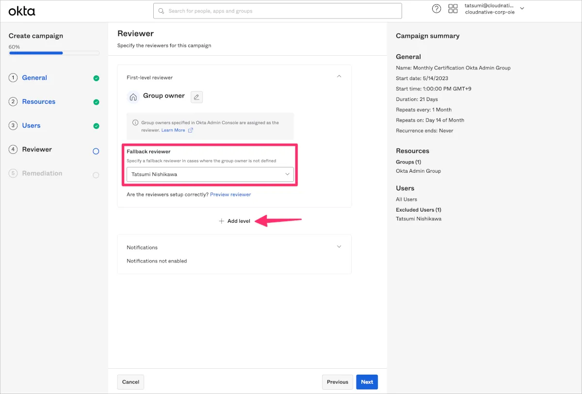 さらに、今回はレビュアーを2段階にしたいため、Add levelをクリックします。