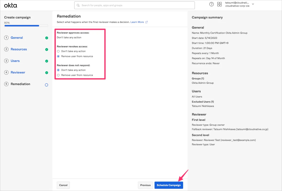 - Remediationでは、すべてのレビューが完了した時にレビュー内容によってどのような作業を実施するかを指定し、Schedule Campaignをクリックします。