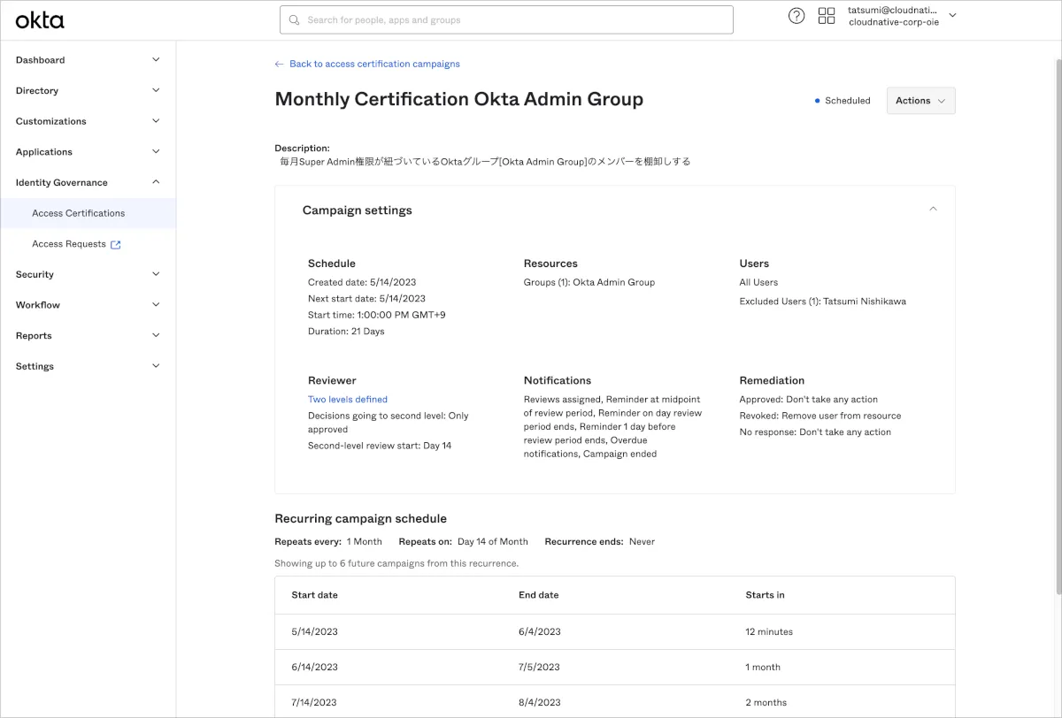 Access CertificationsではOkta上のアプリケーションやグループというリソースに対して不必要な権限の付与が行われていないかを定期的にアクセスレビュー(棚卸)を実施することができます。