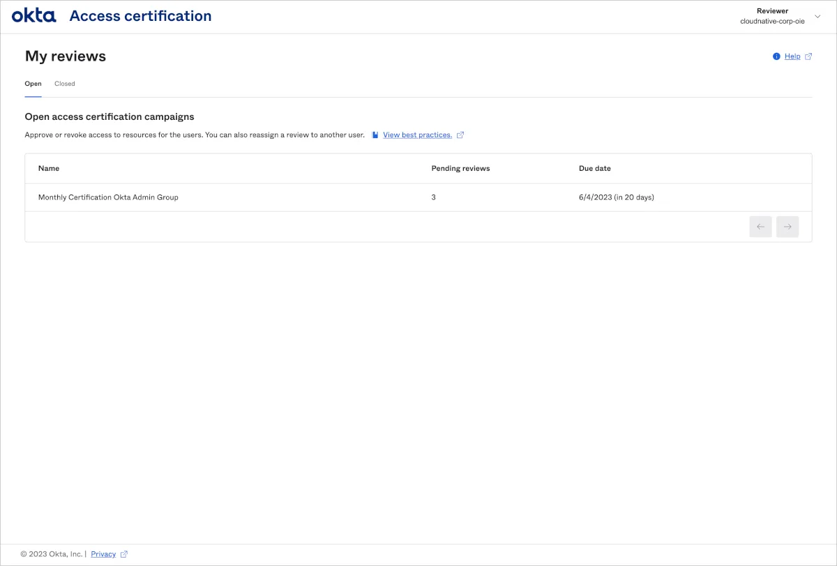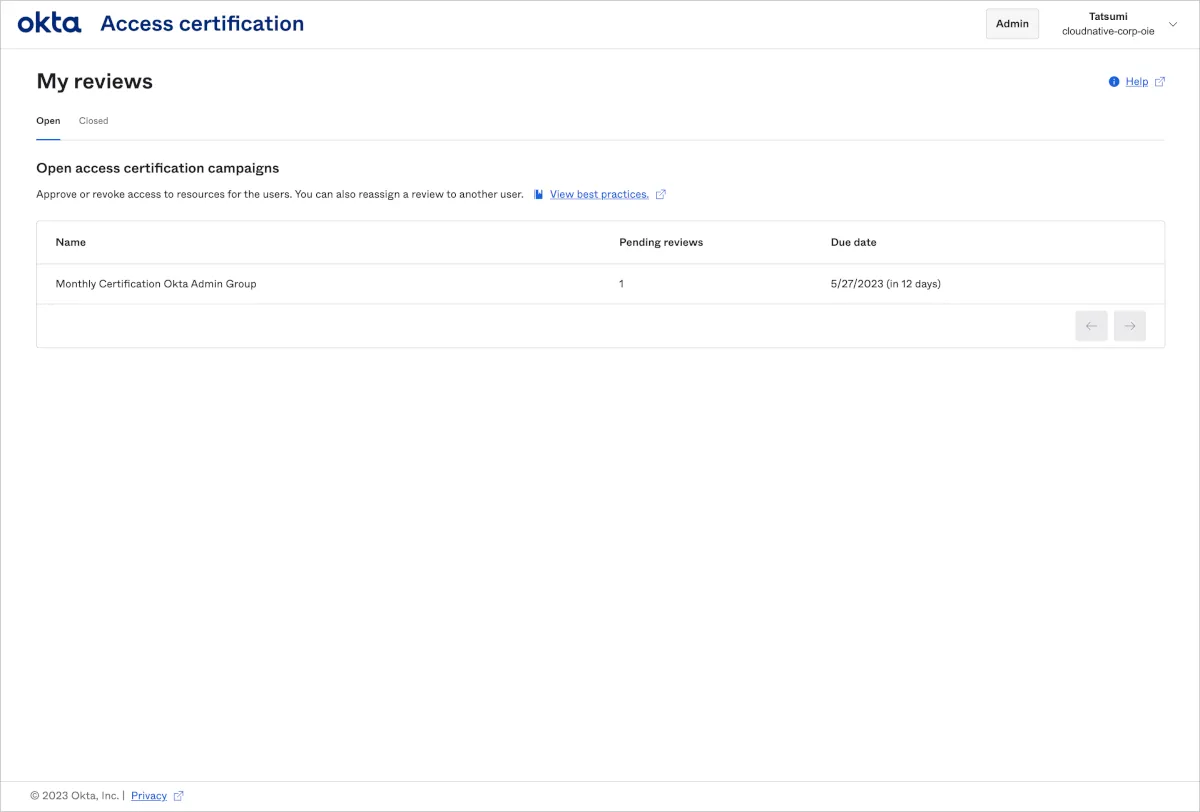 - Otkaダッシュボードから遷移し、割り当てられているAccess Certification campaignをクリックします。