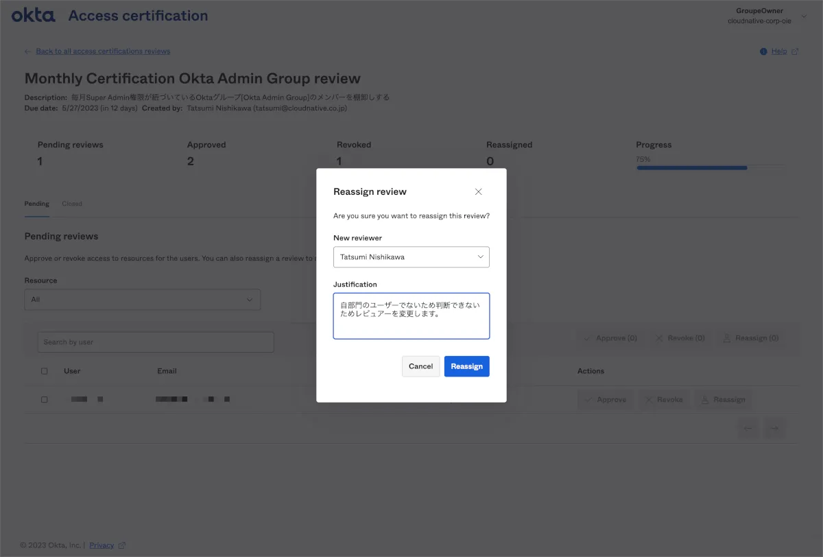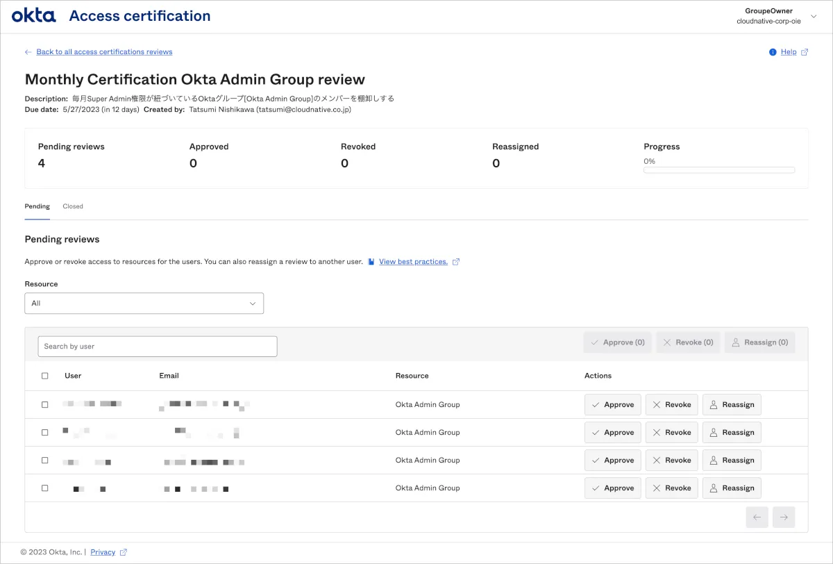 - 以下のように対象メンバーが表示されており、それぞれApprove(承認),Revoke(取り消し),Reassign(レビュアーの再割り当て)が選択できます。