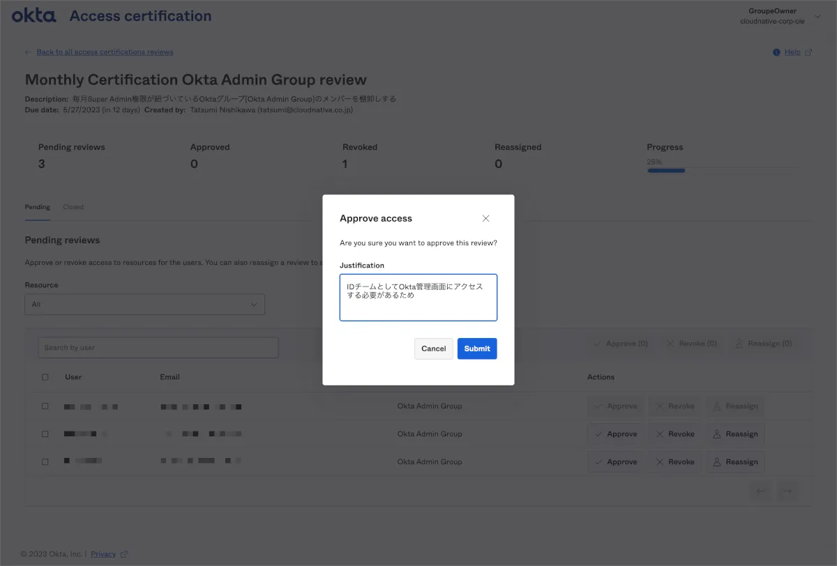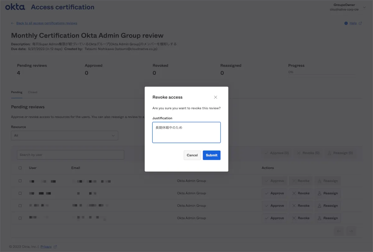 - 例えば以下のように、あるユーザーについてRevoke(取り消し)を選択した場合は理由を記載し、Submitをクリックします。