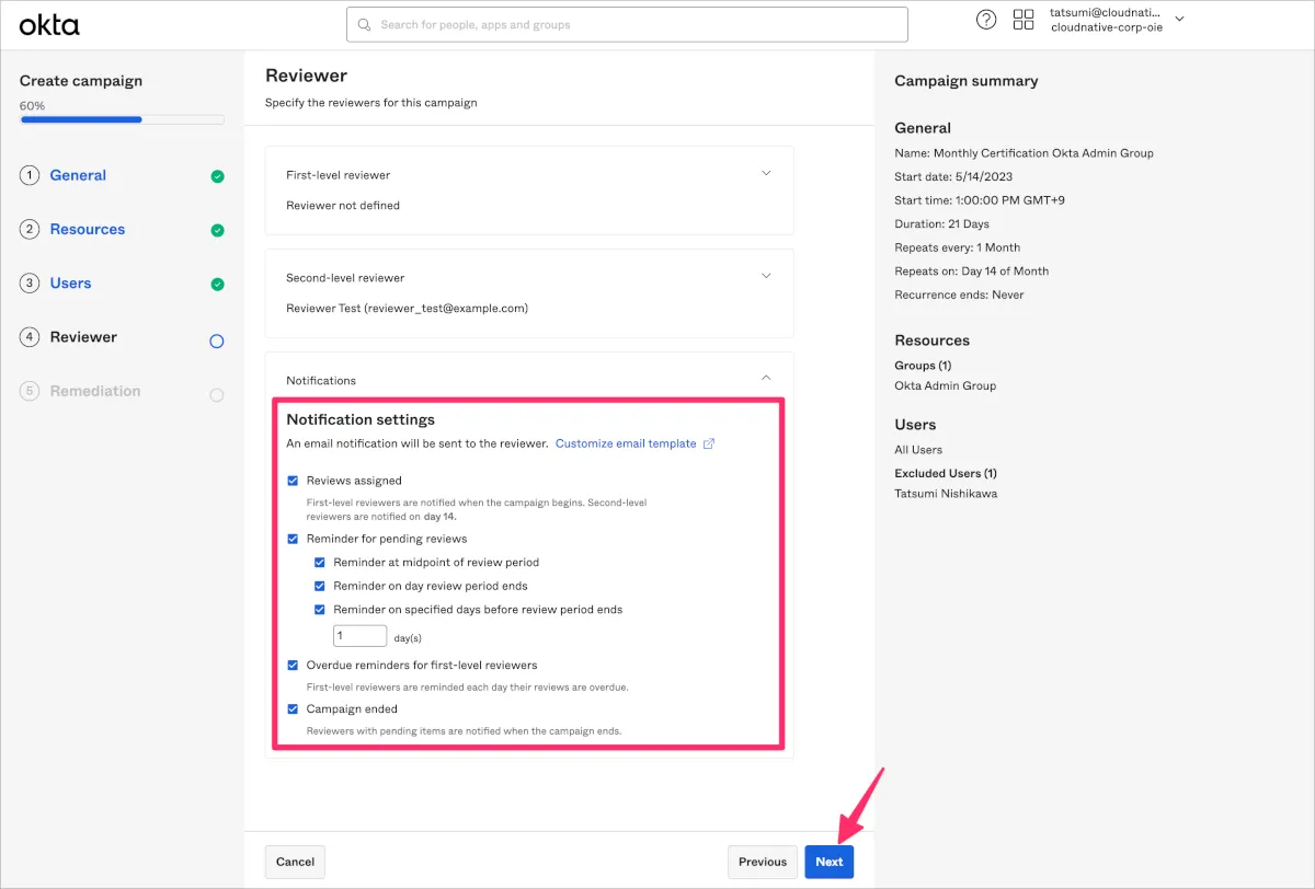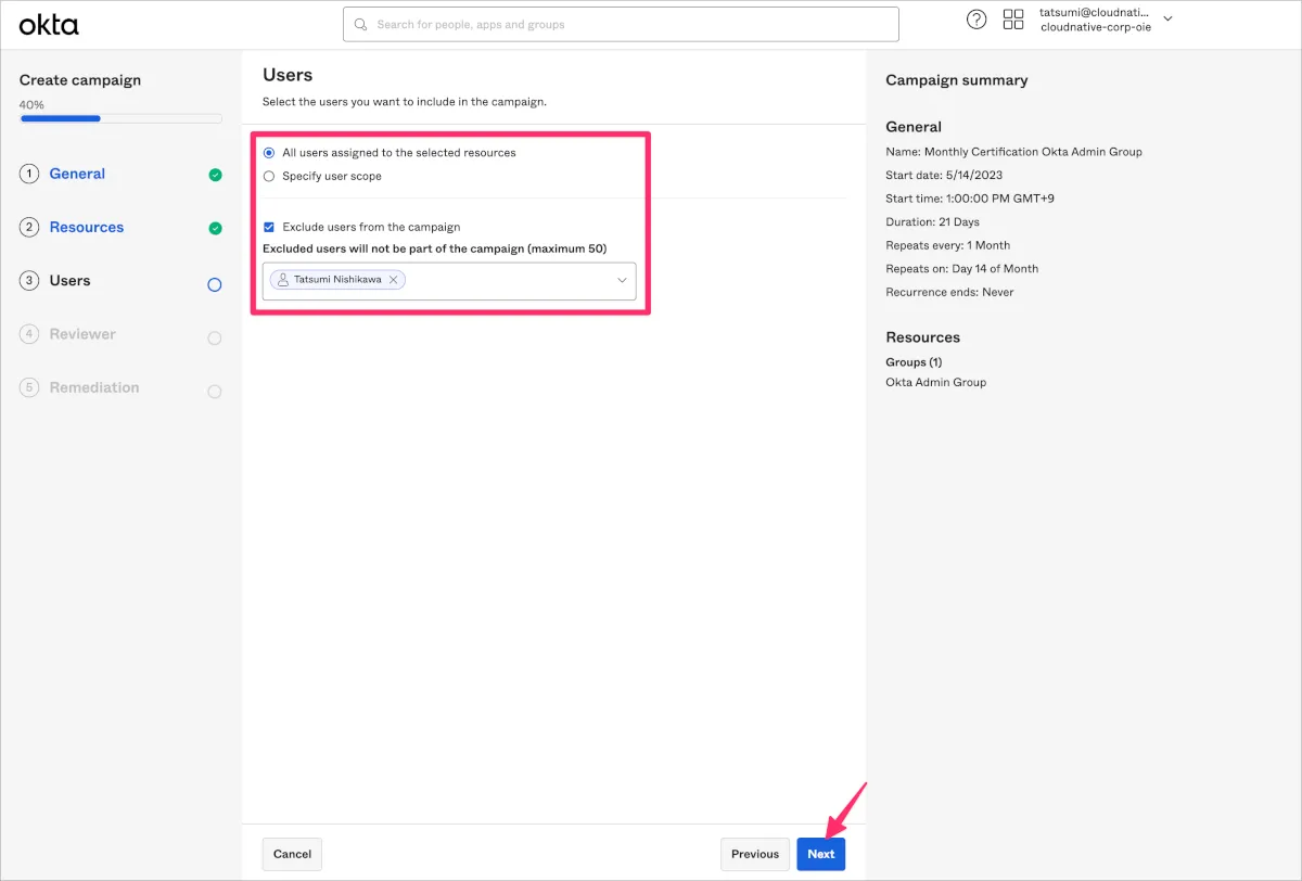 Access Certification campaign対象から除外したいユーザーがいる場合はExclude users from the campaignで指定し、Nextをクリックします。