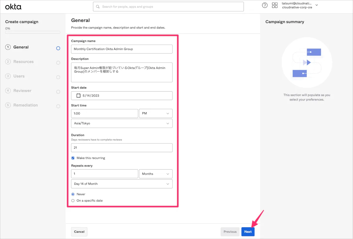 - Generalで以下のようにAccess Certification campaignの名称や説明、スタート日時や期日を入力し、Nextをクリックします。