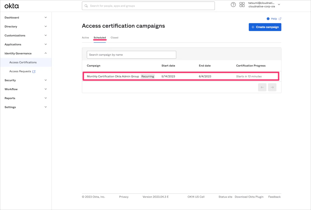 - 作成されたAccess Certification campaignは開始日まではScheduledに表示されます。