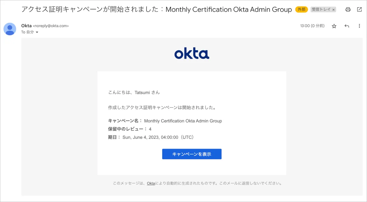 - Access Certification campaignが開始されるとレビュアーには以下のようなメール通知がされます。