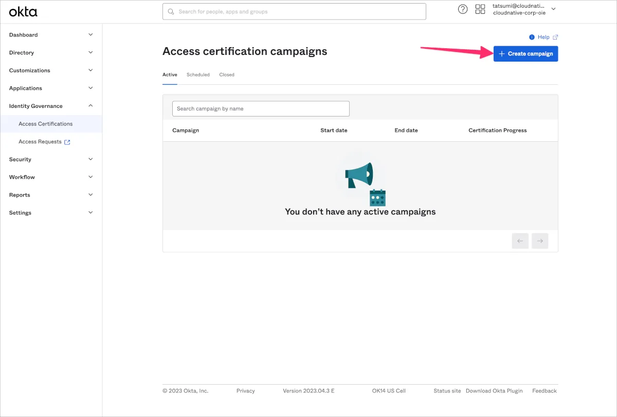 - Okta管理画面>Identity Governance>Access CertificationsからCreate campaignをクリックします。