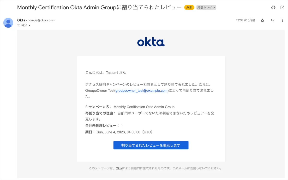 - 再割り当て先として指定されたレビュアーには以下ようなメール通知がされます。