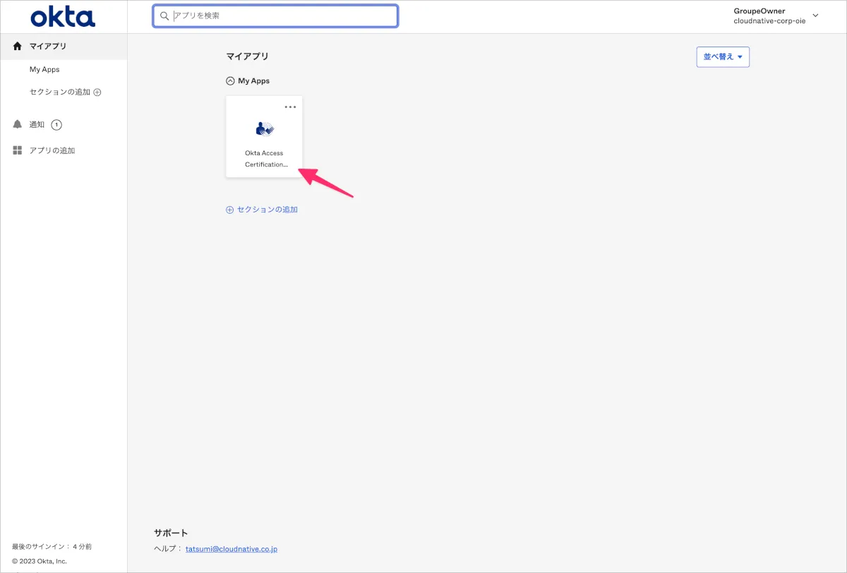 - レビュアーのOktaダッシュボードにはOkta Access certificationが表示されているのでクリックします。