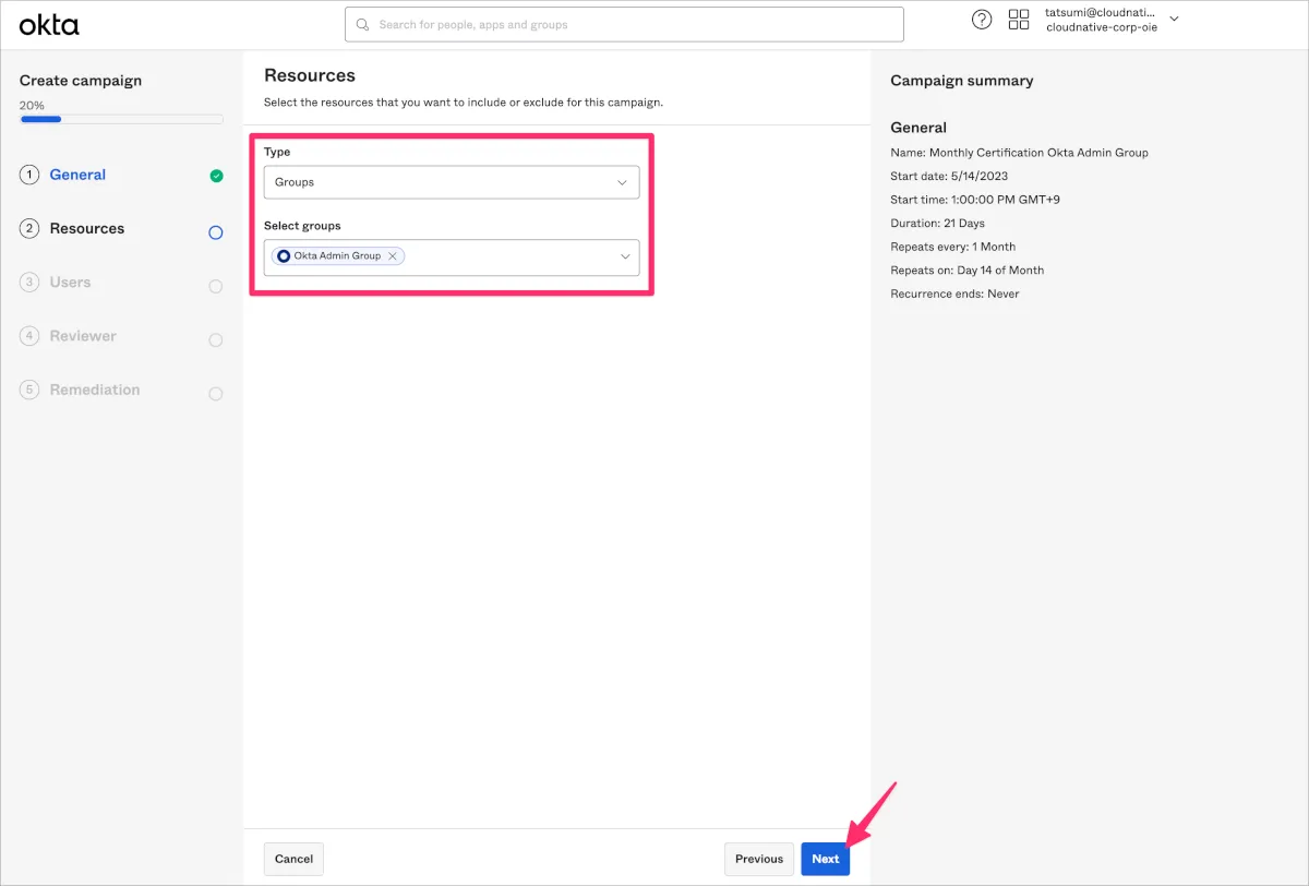 - Resourcesで以下のようにAccess Certification campaign対象を指定し、Nextをクリックします。