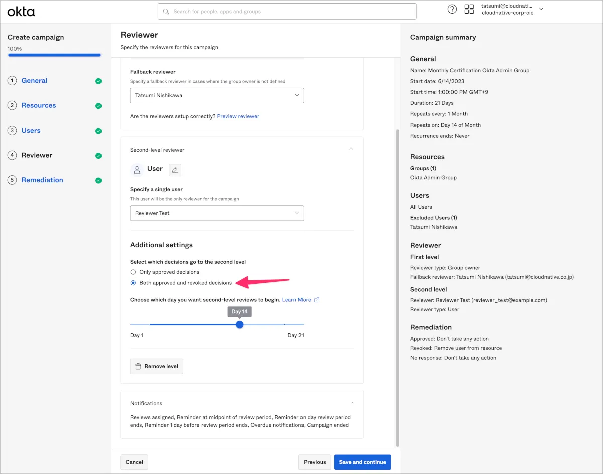 最終決定を2段階目で実施する設定とすることで、Revokeされる対mングを2段階目にすることもできます。その場合はAccess Certification campaignを作成する際のReviewerのAdditional SettingsでBoth approved and revoked decisionsを選択することで実現できます。
