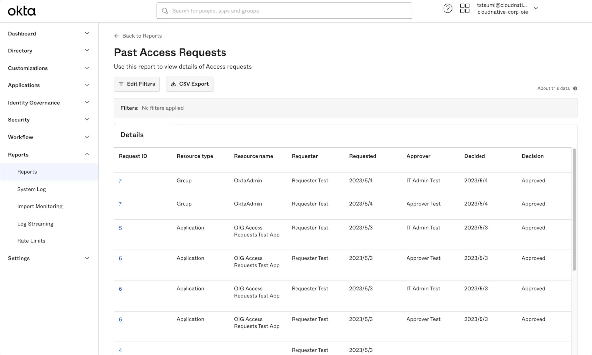 Governance Reportsでは主に完了したAccess Certificationsに基づいたレポートを利用することができます。また、Access Requestsについてのレポートも利用することができます。