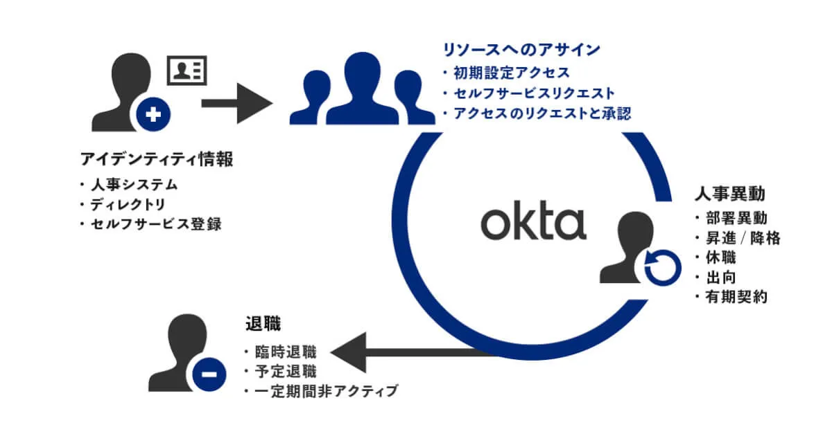 入社・属性変更(部署異動や役職変更)そして退社といったこれら全てを含めて、IDライフサイクルと呼ばれています。